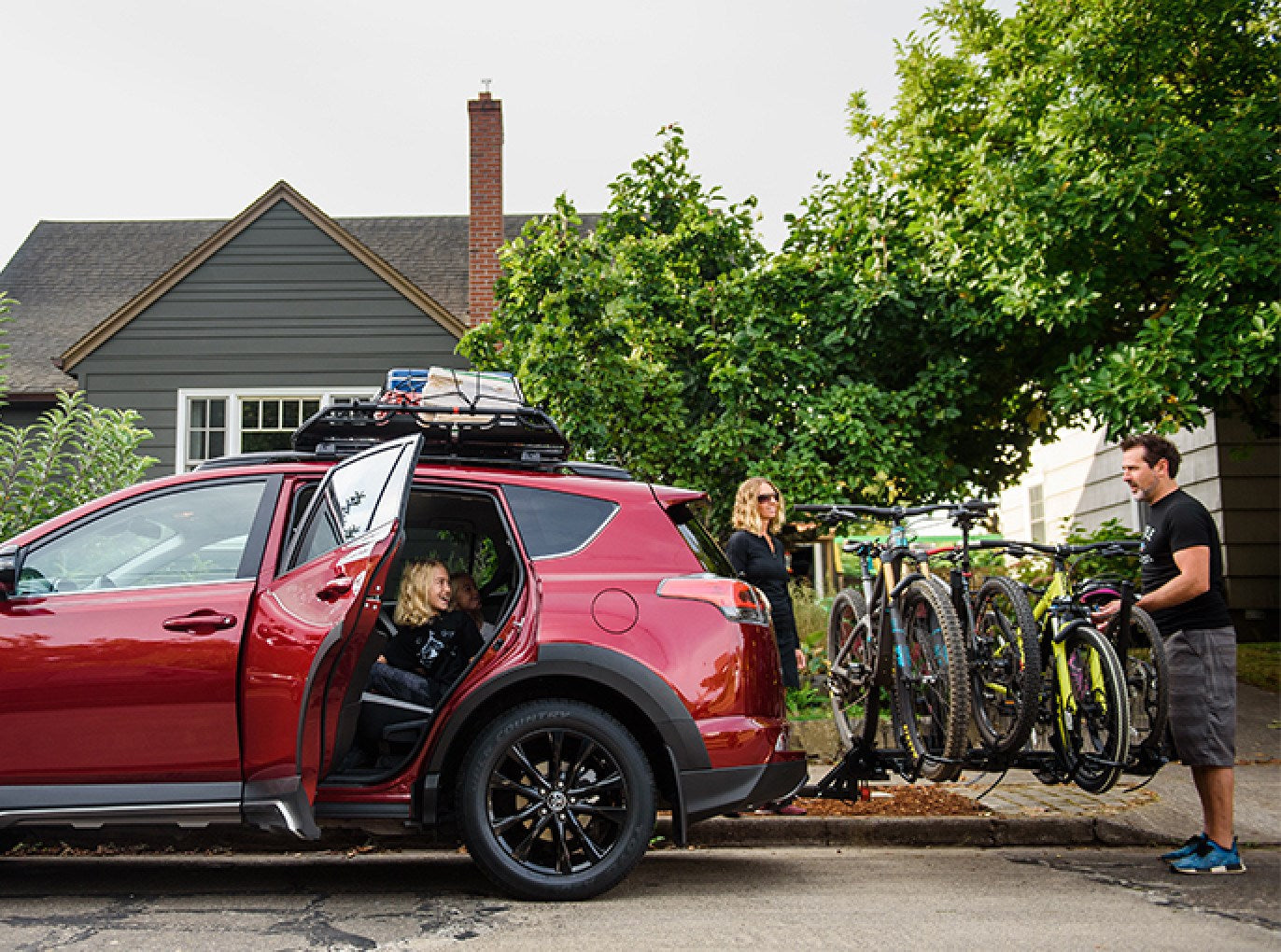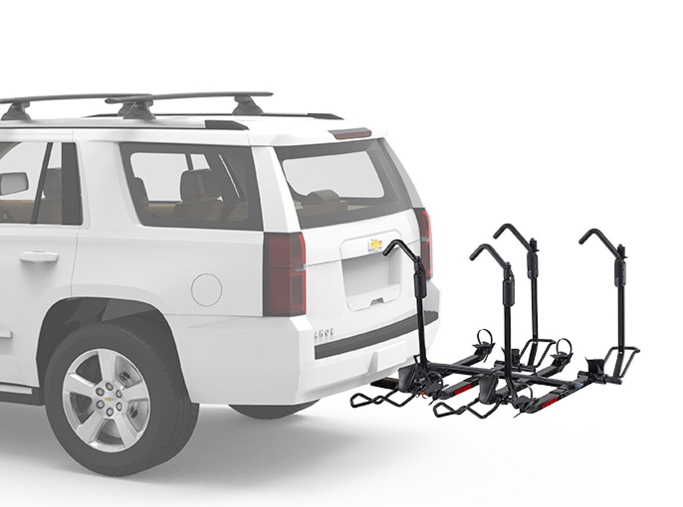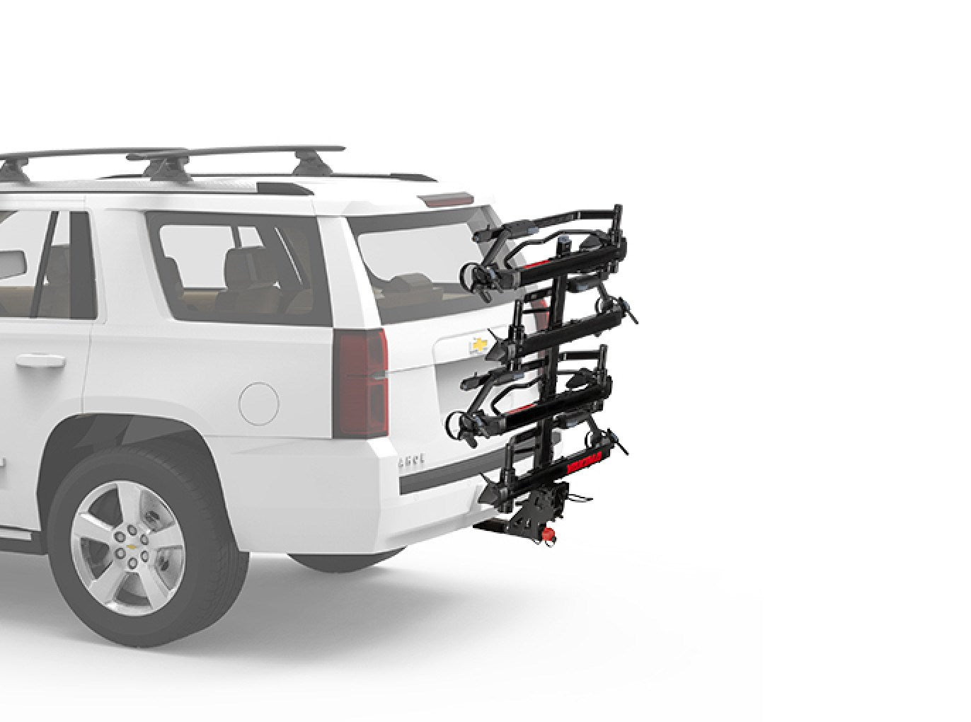 Great for families, double dates, or bringing your entire bike quiver, the HoldUp EVO +2 turns the 2" HoldUp EVO into a four-bike hauler.It's versatile enough to handle most bikes, from BMX to fat tire bikes.The StrongArm hook secures the bikes at their wheels, protecting carbon frames and painted surfaces.The whole unit can still tilt down and out of the way with bikes loaded, for easy rear-of-vehicle access, and the empty trays fold up and out of the way when not in use. Included SKS locks for each bike give you peace of mind.